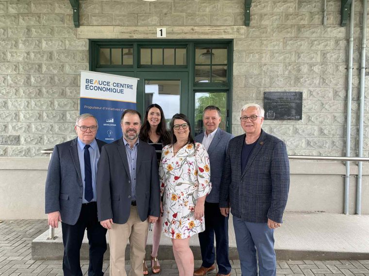Sur la photo : M. Luc Provençal, député de Beauce-Nord, M. David Lemieux, conférencier de la 26e Soirée des Sommets et président de KSM, Mme Catheryne Fecteau, Mallette, Mme Dominic Paré, présidente de BCÉ, M. Daniel Chaîné, directeur général de BCÉ et M. Mario Groleau, maire de Tring-Jonction