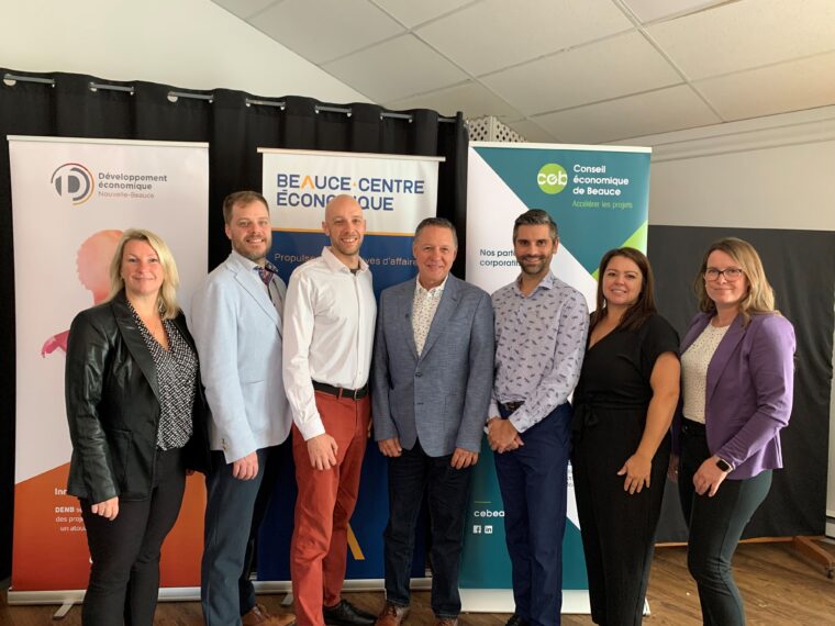 Sur la photo : Mme Marlène Bisson, Développement économique Nouvelle-Beauce, M. Roger Pichette, BB Immigration, M. Laurent Robitaille-Lainesse, Québec International, M. Daniel Chaîné, Beauce-Centre Économique, M. Étienne Hébert, Québec International, Mme Hélène Latulippe, Conseil économique de Beauce et Mme Julie Rodrigue, Ministère de l’Immigration, de la Francisation et de l’Intégration