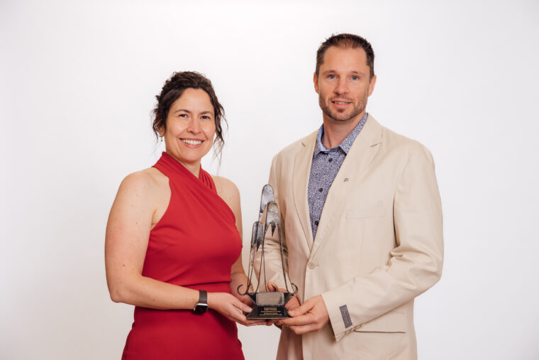 Sur la photo : Mme Dominique Nadeau, Safari Condo et M. Jérôme Gilbert, Promutuel Assurance (Crédit : Caroline Fournier)
