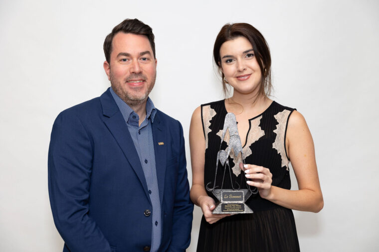 Sur la photo : M. Alexandre Pelletier, Hydro-Québec et Mme Elisabeth Turcotte, Déniche Ton Chien.