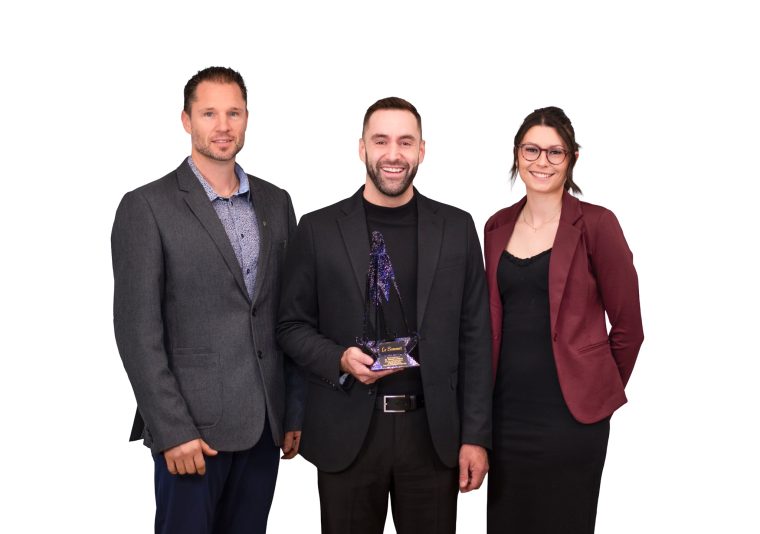 Sur la photo : M. Jérôme Gilbert, Promutuel Assurance, M. David Latulippe, récipiendaire du Sommet VRAIment Beauce 2025 et Mme Jadrique Pagé, Beauce-Centre Économique.