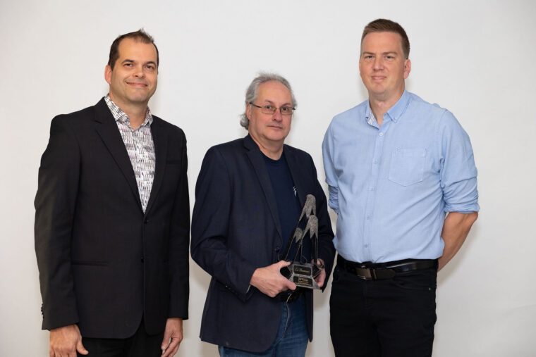 Sur la photo : M. Éric Brousseau, Raymond Chabot Grant Thornton et messieurs Éric Veilleux et Louis-Alexandre Jacques de MBI Plastique.